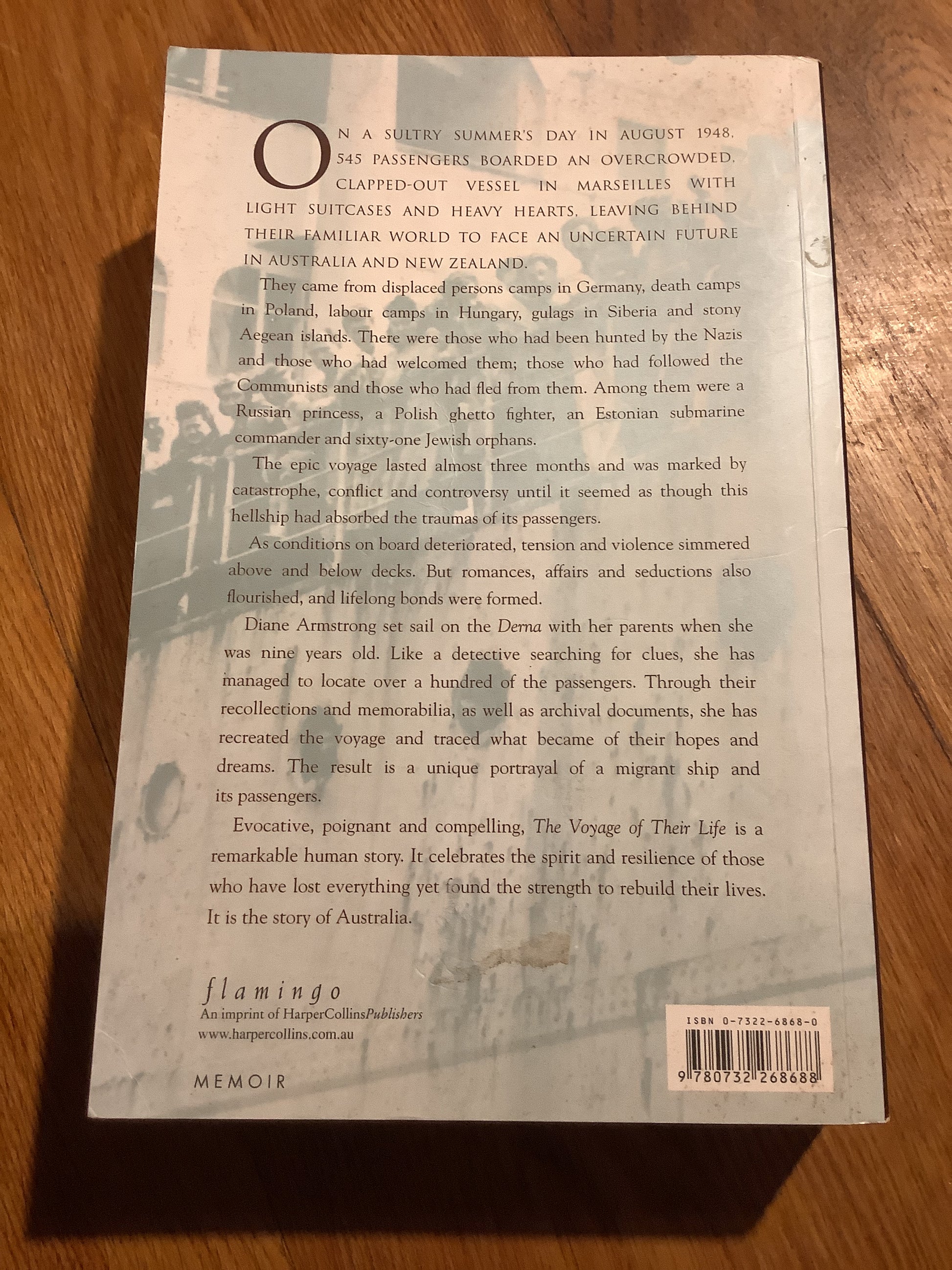 Diane Armstrong set sail on the Derma with her parents when she was nine years old. Like a detective searching for clues, she has managed to locate over a hundred of the passengers. Through their recollections and memorabilia, as well as archival documents, she has recreated the voyage and traced what became of their hopes and dreams. The result is a unique portrayal of a migrant ship and its passengers.