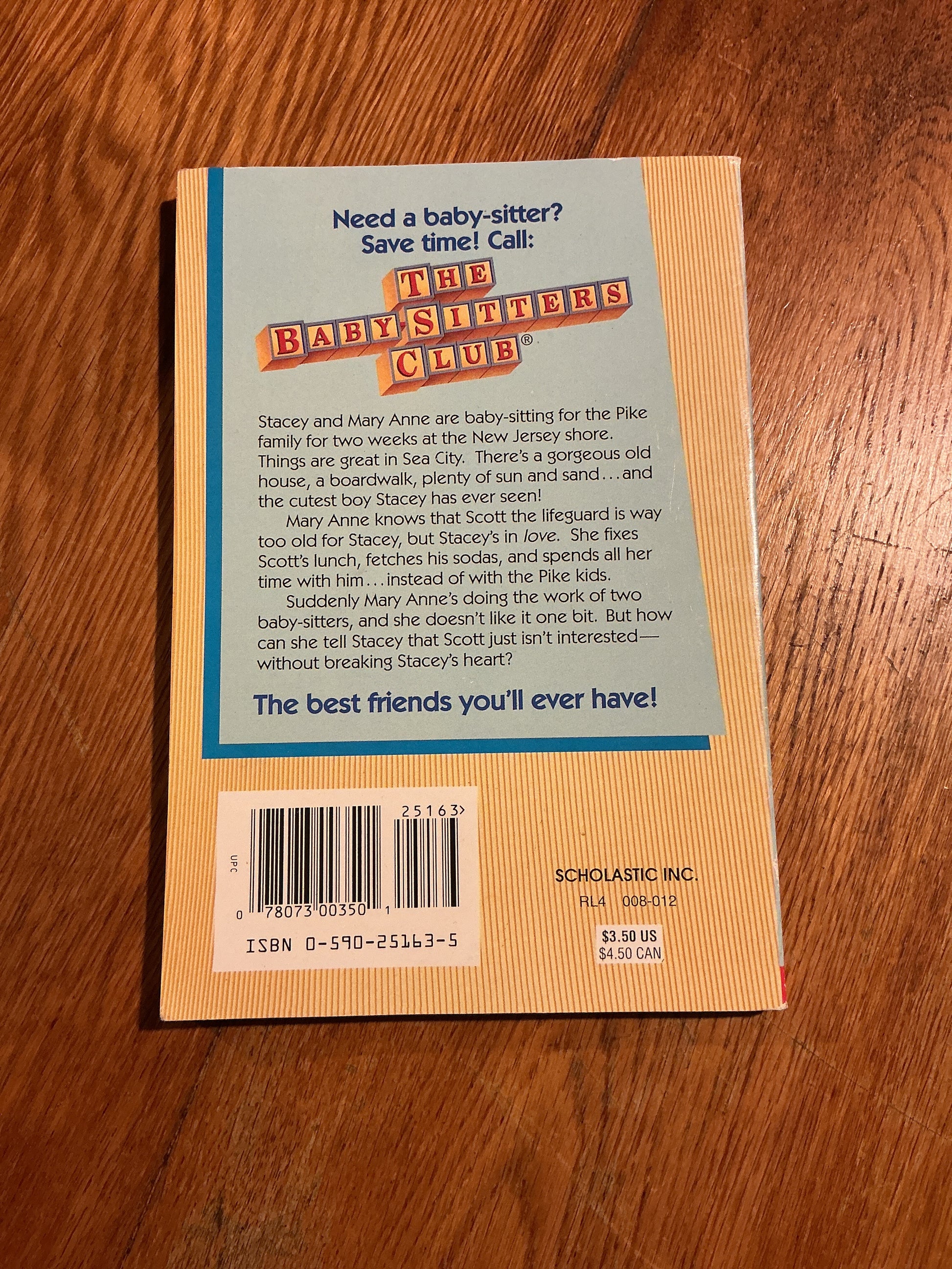 Mary Anne knows that Scott the lifeguard is way too old for Stacey, but Stacey’s in love. She fixes Scott’s lunch, fetches his sodas, and spends all her time with him……instead of with the Pike kids.