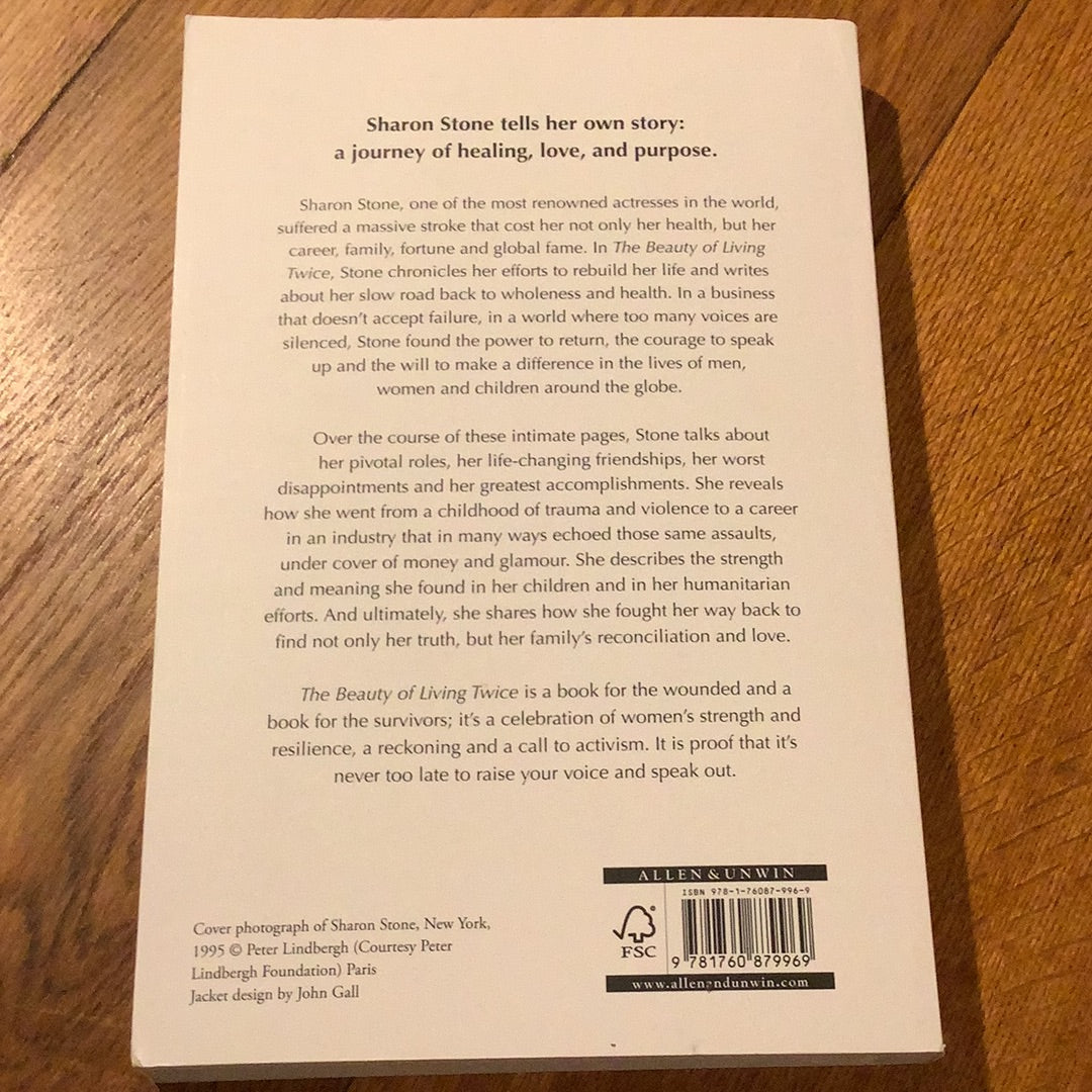 Sharon Stone, one of the most renowned actresses in the world, suffered a massive stroke that cost her not only her health, but her career, family, fortune and global fame. In the Beauty of Living Twice, Stone chronicles her efforts to rebuild her life and writes about her slow road back to wholeness and health.nIn a business that doesn’t accept failure, in a world where too many voices are silenced, Stone found the power to return, the courage to speak up and the will to make a difference in the lives of men, women and children around the globe.