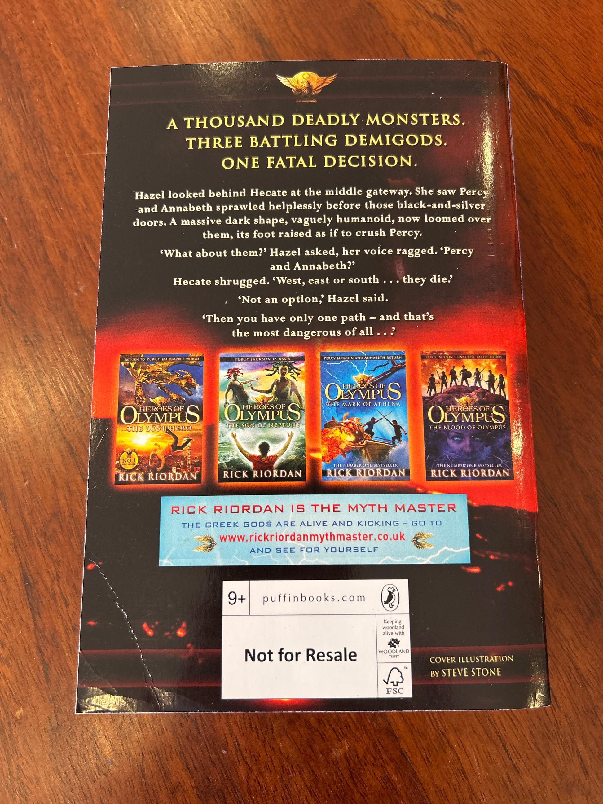 Hazel looked behind Hecate at the middle gateway. She saw Percy and Annabeth sprawled helplessly before those black-and-silver doors. A massive dark shape, vaguely humanoids, now loomed over them, its’ foot raised as if to crush Percy.