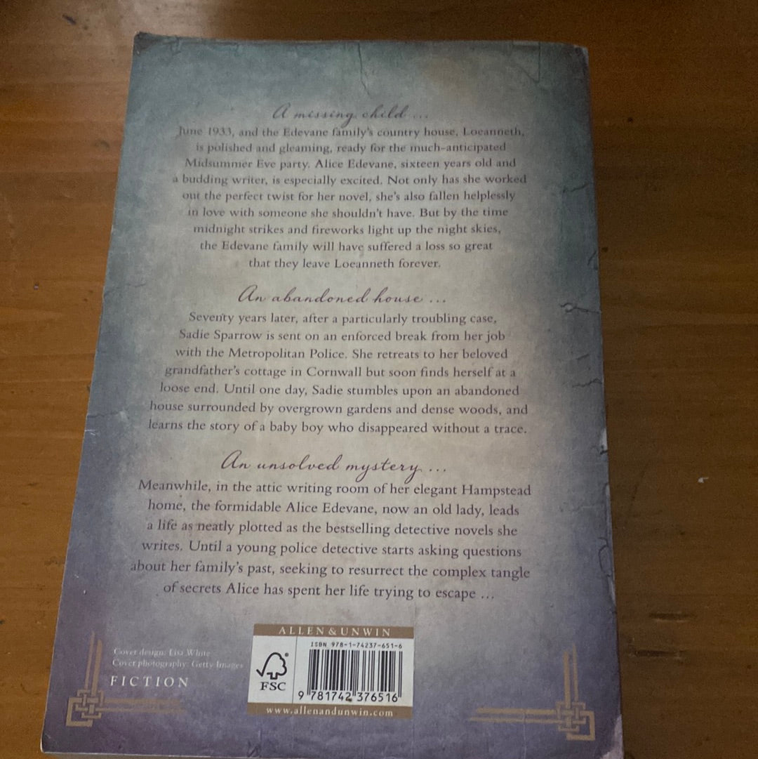 June 1933, and Edevane family's country house, Loeanneth, is polished and gleaming, ready for the much anticipated Midsummer Eve party. But by the time midnight strikes and the fireworks light up the night skies, the Edevane family will have suffered a loss so great that they leave Loeanneth forever.