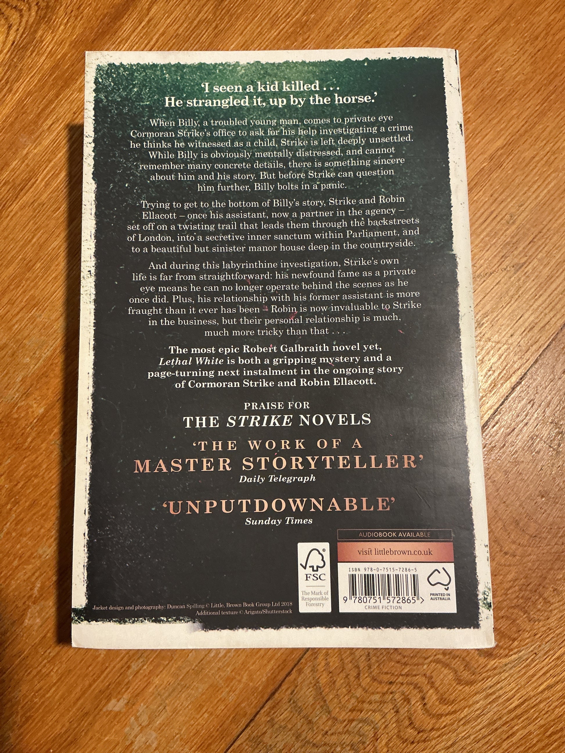 Trying to get to the bottom of Billy’s story, Strike and Robin Ellacott - once his assistant, now a partner in the agency - set off on a twisting trail that leads them through the backstreets of London, into a secretive inner sanctum within Parliament, and to a beautiful but sinister manor house deep in the countryside.