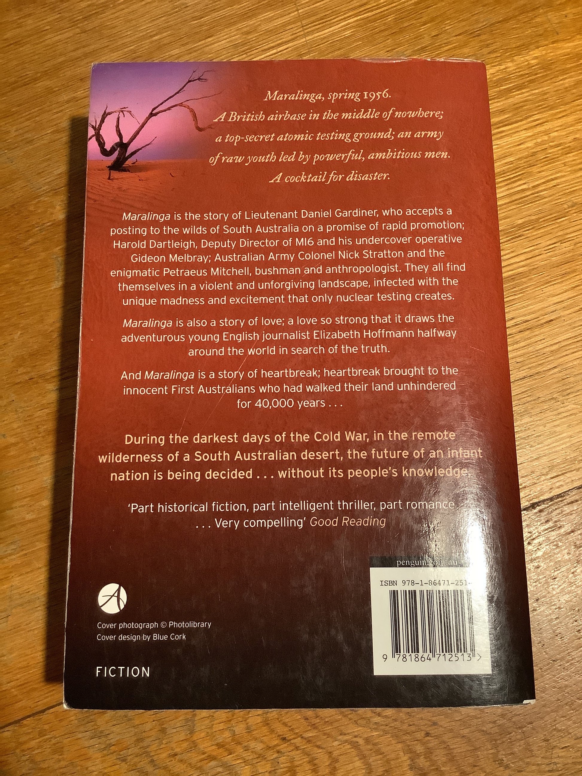 Maralinga is the story of British Lieutenant Daniel Gardiner, who accepts a twelve-month posting to the wilds of South Australia on a promise of rapid promotion; Harold Dartleigh, Deputy Director of MI6 and his undercover operative Gideon Melbray; Australian Army Colonel Nick Stratton and the enigmatic Petraeus Mitchell, bushman and anthropologist. They all find themselves in a violent and unforgiving landscape, infected with the unique madness and excitement that only nuclear testing creates.